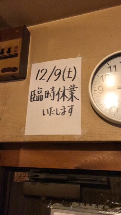 明日(12/9)は臨時休業させていただきます。